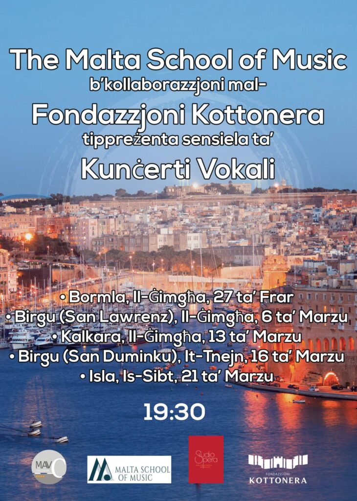 Mikiel Anton Vassalli College (MAVC), through the Malta School of Music, in collaboration with Fondazzjoni Kottonera, proudly presents Kunċerti Vokali, a series of vocal concerts being held across the Cottonera during February and March. The concerts will take place in Bormla, Birgu, Kalkara and Isla, bringing high-quality musical performances into the heart of these historic communities.